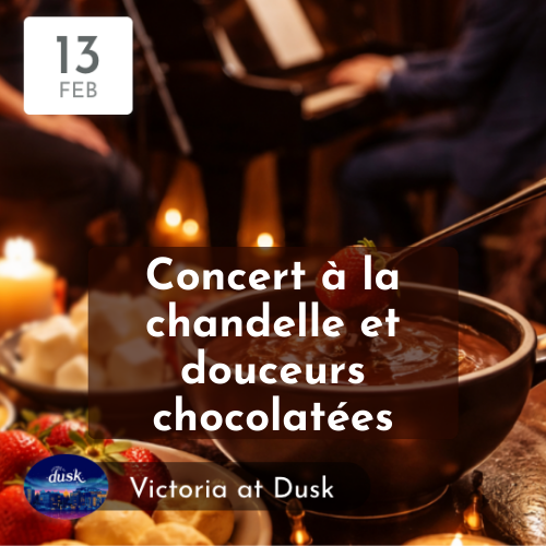 Dans le cadre de Victoria at Dusk, la SFV vous invite à vivre une soirée tout en douceur : un concert aux chandelles accompagné d’une fondue au chocolat. Laissez-vous envelopper par la voix apaisante de Sara Rose, puis par la poésie du piano de Raphaël L., pour un moment musical et gourmand à partager.